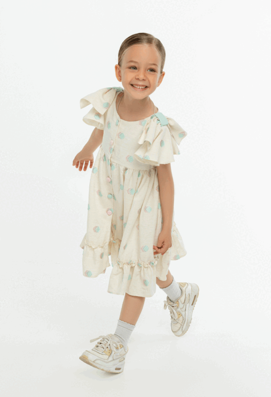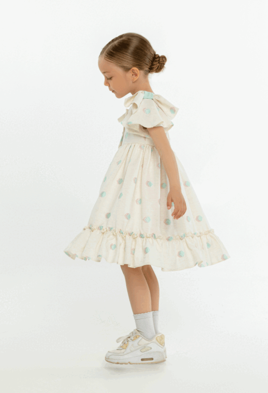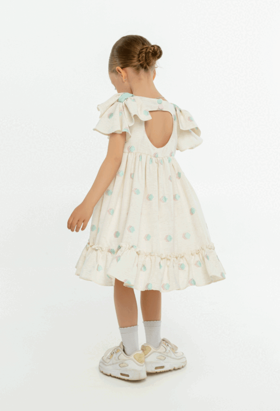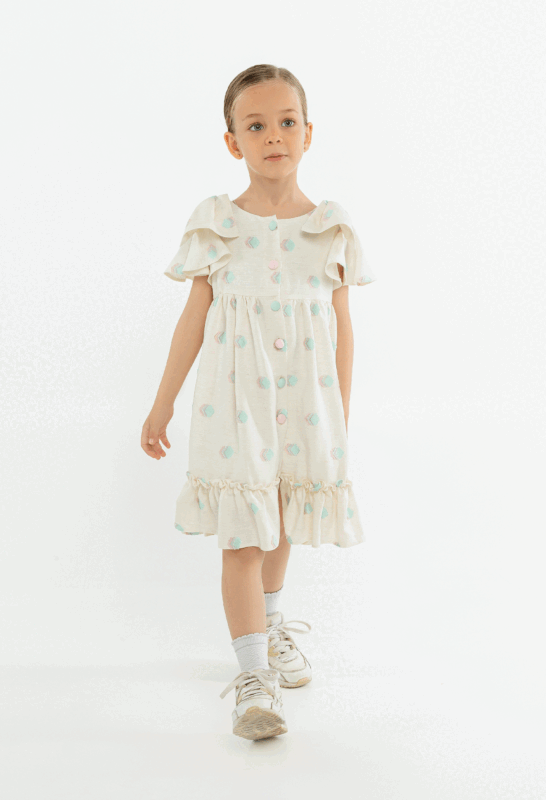 კაბა ხალათი მოკლე მკლავით, მკლავზე რუშით, გადაკრული ფერადი ღილებით, კრემისფერი სალათისფერი და ვარდისფერი კუბებით