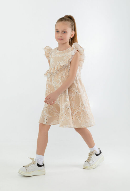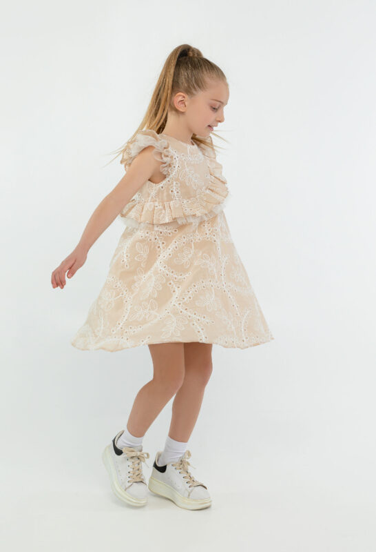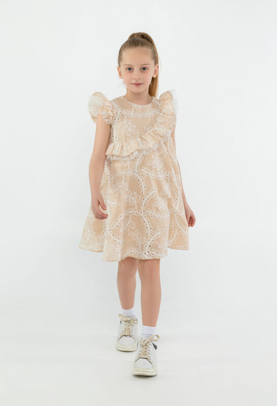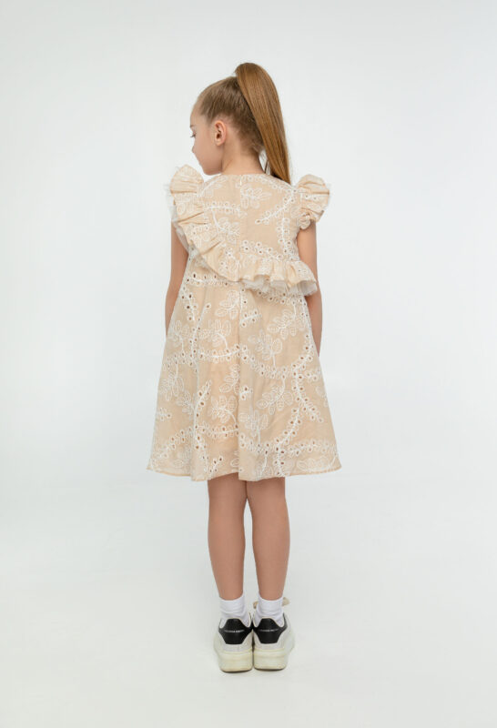 კაბა მხარზე რუშით, ნაქარგი ქსოვილით და წულით, კრემისფერი