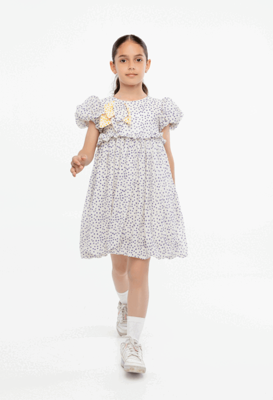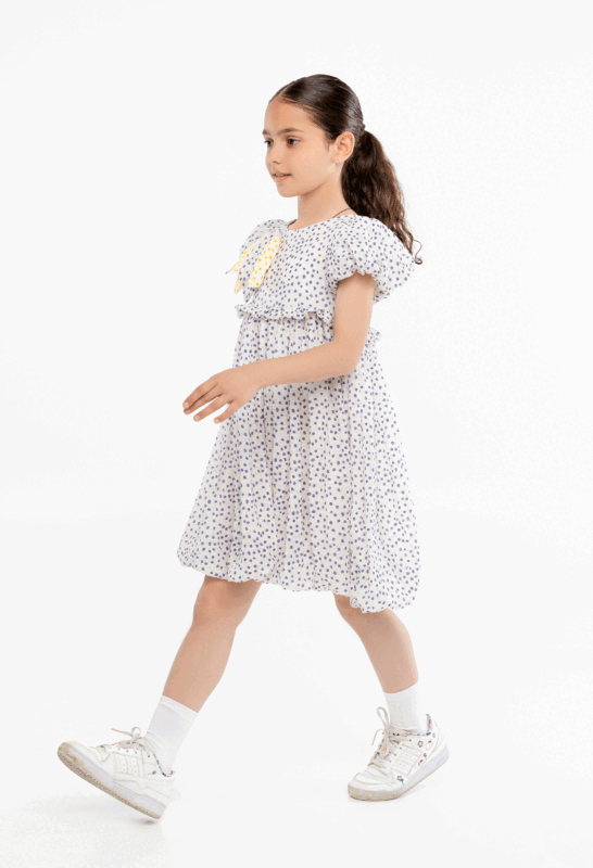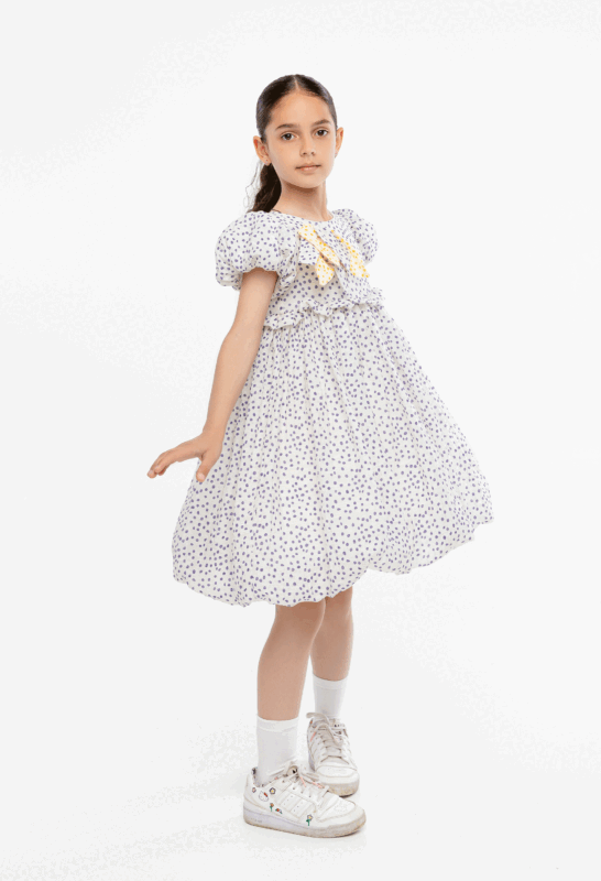 კაბა ტულის, გაბერილი მკლავით, გულზე ბანტით, თეთრი იასამნისფერი კოპლებით