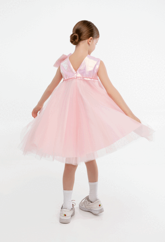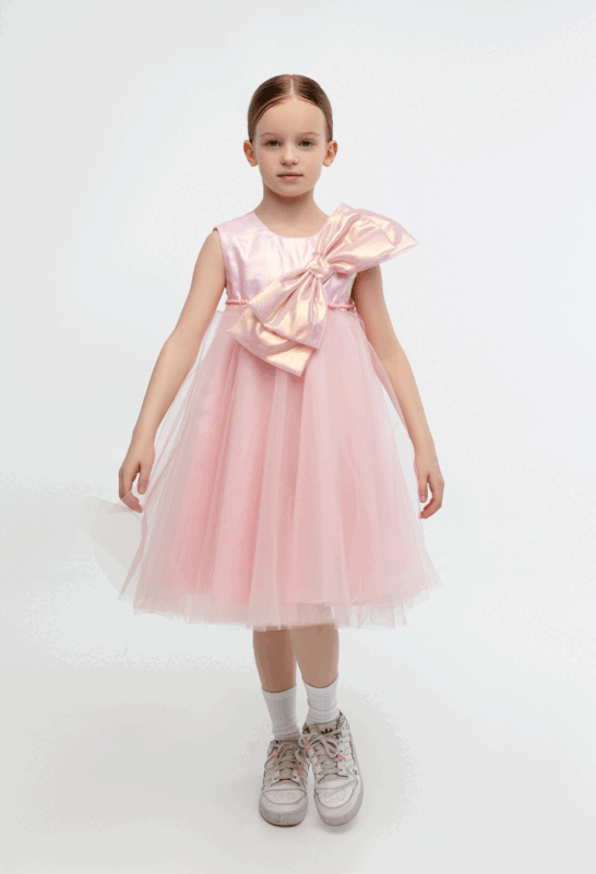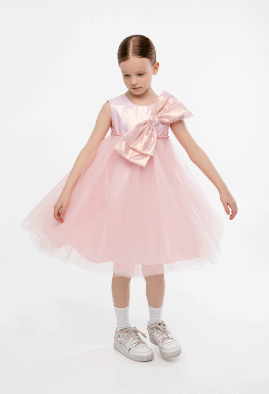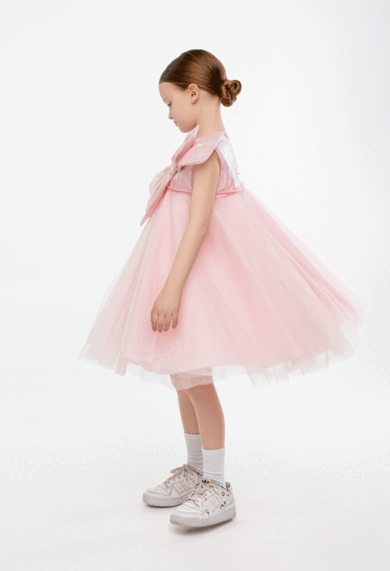 კაბა ტულის, გულზე ბანტით, ვარდისფერი
