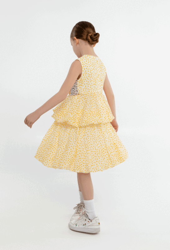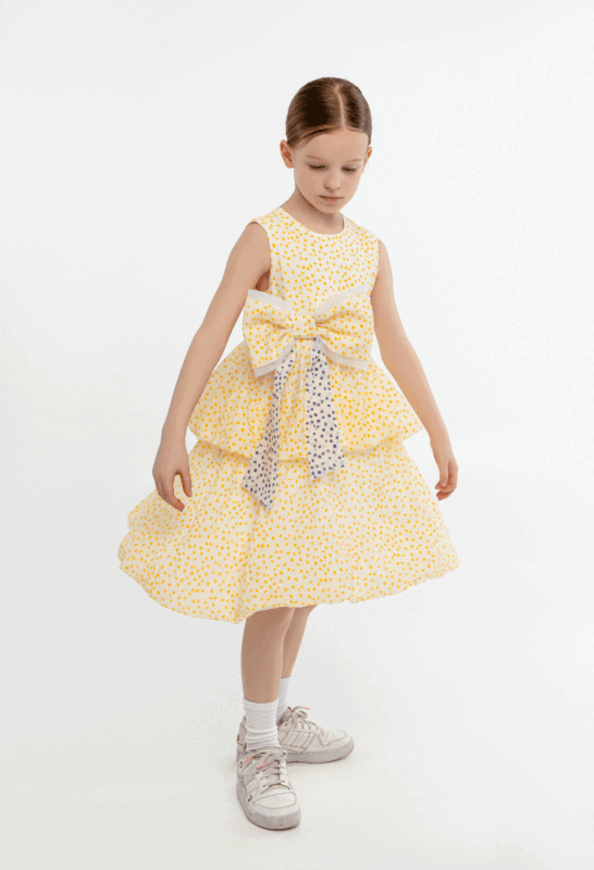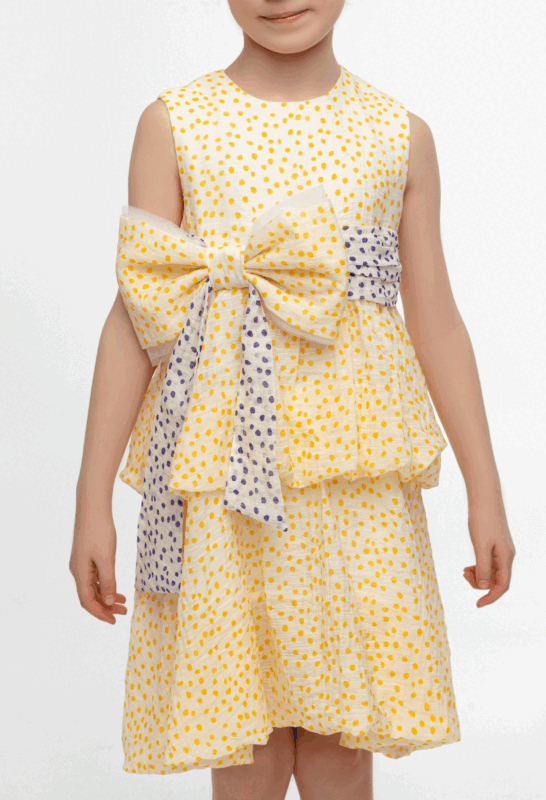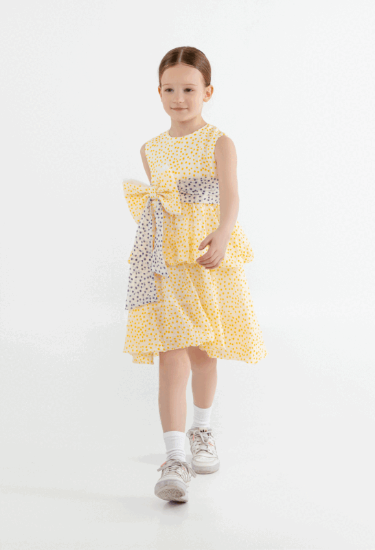 კაბა ტულის, წელზე ბანტით, ყვითელი კოპლებით